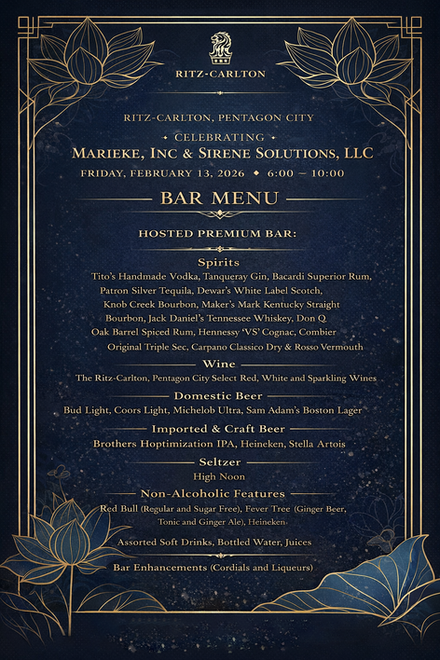 Ritz Carlton Dinner Event with custom invitations, bar/dinner menus, place cards, and a QR Code for menus. Our suite ensures seamless events and sophisticated branding for Marieke, Inc and Sirene Solutions.